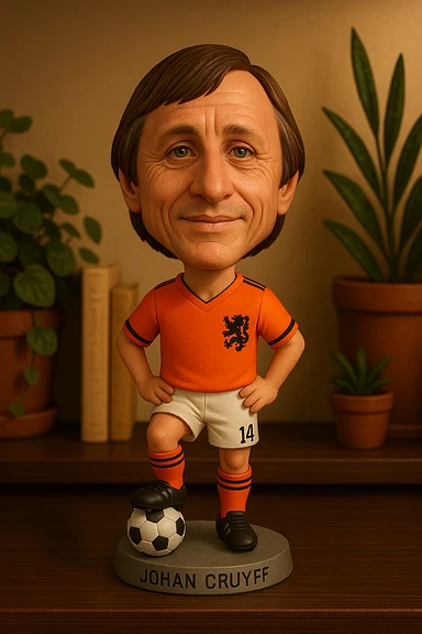 молодой Йохан Кройф в форме команды нидерландов образца 1974 года смотрит прямо на зрителей. левая рука на бедре, правая рука опущена вниз. цвет майки оранжевый. шорты белые, и гетры оранжевые. на его шортах изображен его номер - 14 meme | AI Emoji Generator
