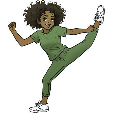 a smiling black girl with curly hair and brown eyes, kicking her feet emoji
