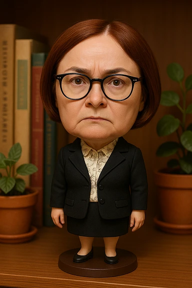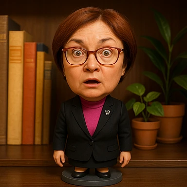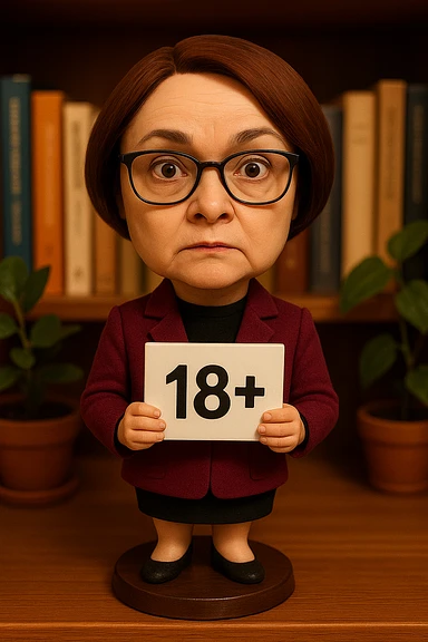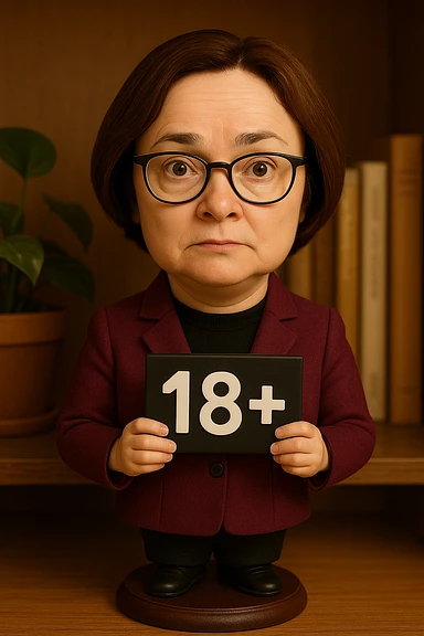 Удивленная Эльвира Набиуллина смотрит прямо на зрителя и держит в руках табличку 18+ emoji