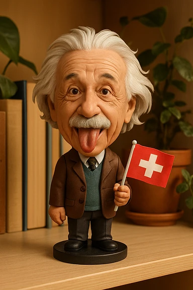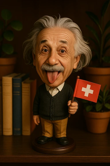 Альберт Эйнштейн показывает язык и держит в руке флаг Швейцарии emoji
