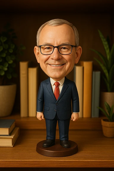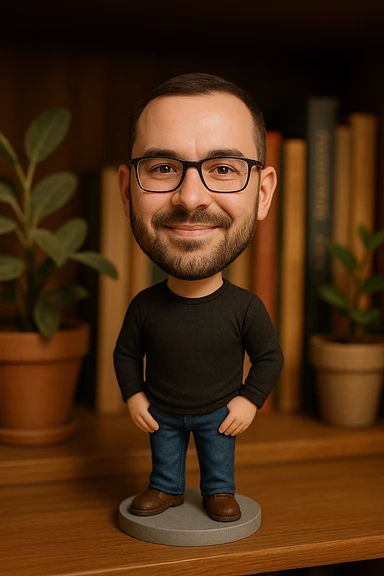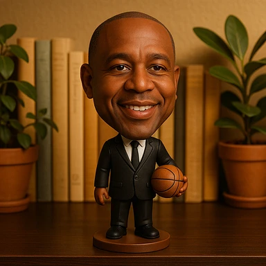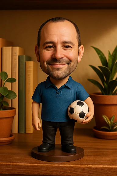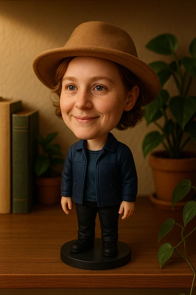 Create a bobblehead style portrait of the person in the reference image, wearing sunglasses, similar to the previous cat with sunglasses concept. Focus on capturing the bobblehead style with a playful and exaggerated head shape and sunglasses. emoji