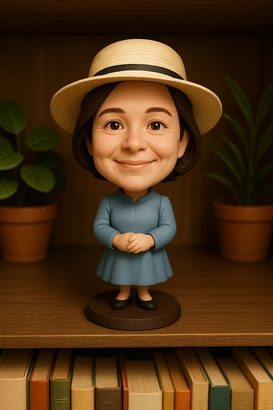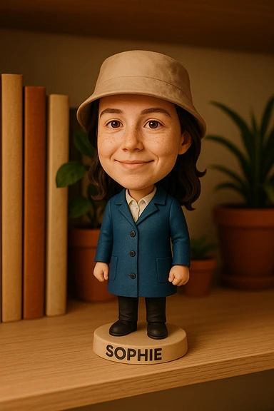 Create a bobblehead style portrait of the girl from the provided image, featuring a large head, cute features, and a soft pastel background. The style should be a digital illustration matching the bobblehead style with a charming and playful look. emoji