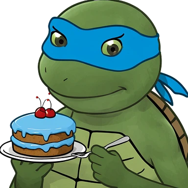 ninja turtle wearing blue eye mask eating cake with blue icing emoji