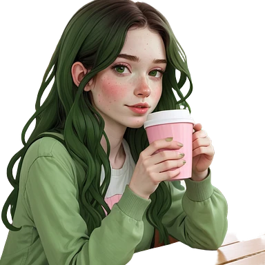 Girl with long dark slightly wavy hair and pale skin with freckles wearing cottage core outfit with pinks and whites drinking a coffee emoji