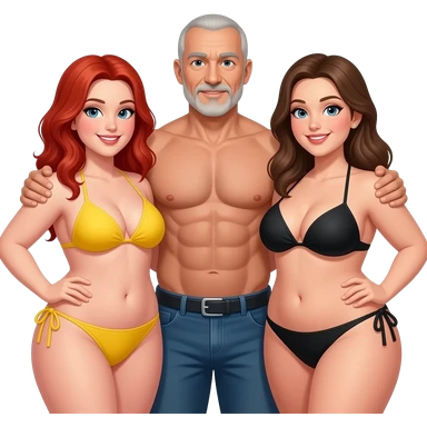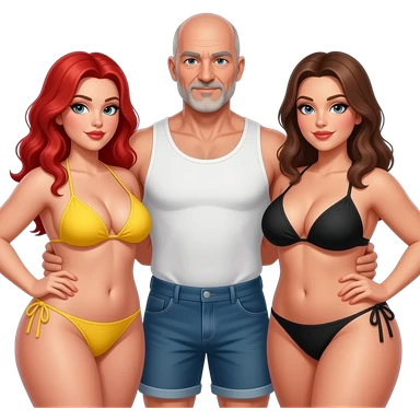Handsome, bald, muscular man with goatee, age 57, standing close between 2 very full figured women in bikinis, redhead with yellow bikini and brunette black bikini with larger breasts emoji
