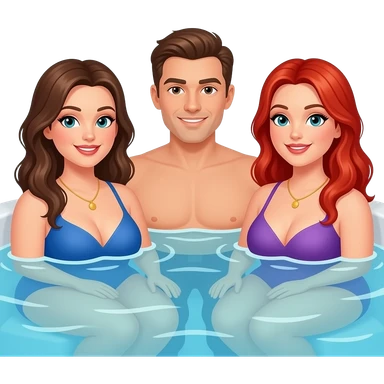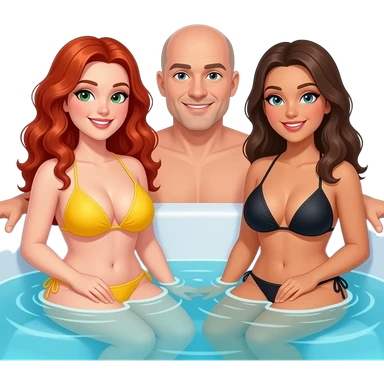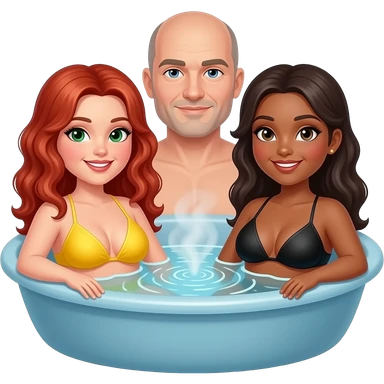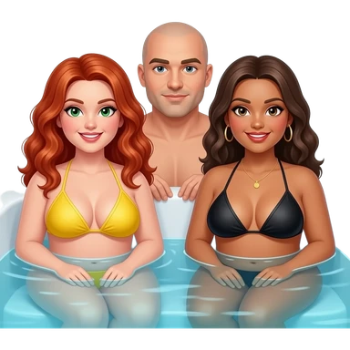 2 very curvy women, 1 redhead with long curly hair, green eyes in a yellow bikini, 1 brunette with black bikini, and 1 man bald with light goatee, sitting in a hot tub emoji