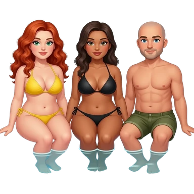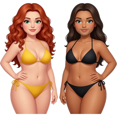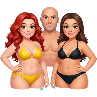 2 very curvy women, 1 redhead with long curly hair, green eyes in a yellow bikini, 1 brunette with black bikini, the 1 man bald with light goatee emoji