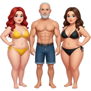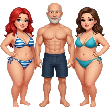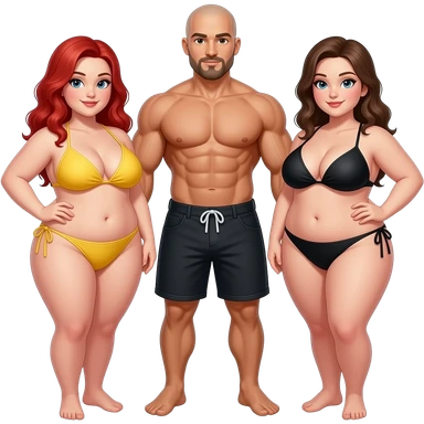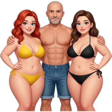 Handsome, bald, muscular man with goatee, age 57, standing between 2 very full figured women in bikinis, redhead with yellow bikini and brunette black bikini with larger breasts emoji