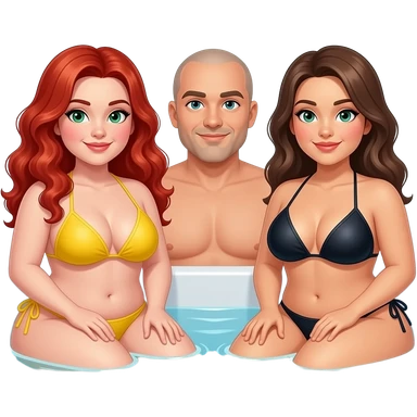 2 very curvy women with very large breasts, 1 redhead with long curly hair, green eyes in a yellow bikini, 1 brunette with black bikini, and 1 man bald with light goatee, sitting in a hot tub emoji