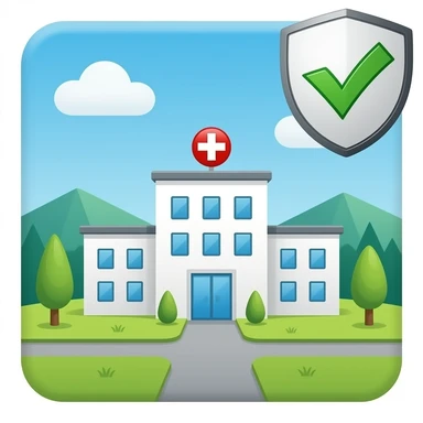 Hospital con la cruz arriba y superpuesto encima a la derecha un escudo con un tick dentro emoji