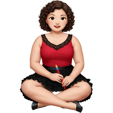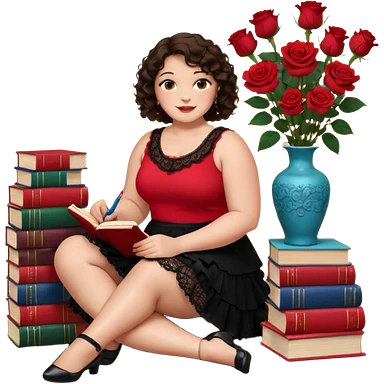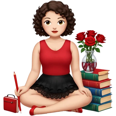 A plus-size brunette woman with short, dark brown curly hair is wearing a red sleeveless shirt and a black lace ruffled skirt. She is sitting on the floor with her legs crossed, holding a crayon in one hand. On the floor are five stacked colorful books and a glass vase with red roses. emoji