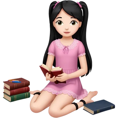 A beautiful girl, wearing a pink lace dress, her long straight black hair is tied in two ponytails, she holds books and crayons in her hands, her feet are bare, sitting on the floor with her legs crossed. emoji