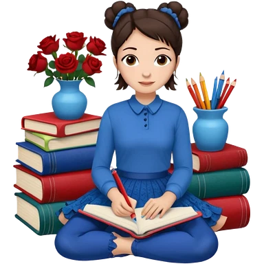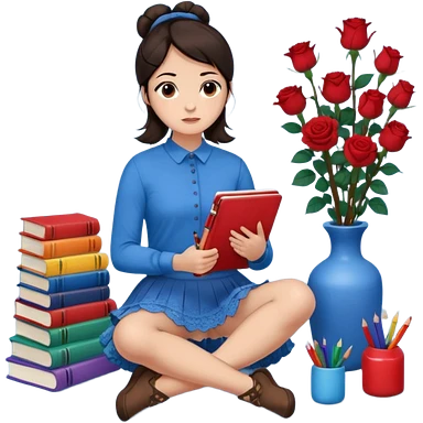 A woman with dark hair, straight and dark brown, styled in two buns, wears a blue long-sleeved shirt and a brown lace ruffled skirt. She holds a crayon in one hand. She sits on the floor with her legs crossed. The floor is covered with five stacks of colorful notebooks and a vase of red roses. emoji
