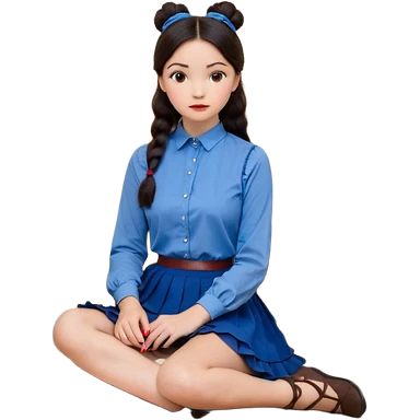 A beautiful girl wears a green lace blouse with short sleeves and a green lace skirt with a plaid pattern. Her long, curly black hair is styled in a messy bun. She holds books and crayons in her hands, and she is barefoot, sitting cross-legged on the floor. The illustration style is pop art. emoji