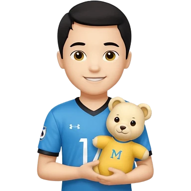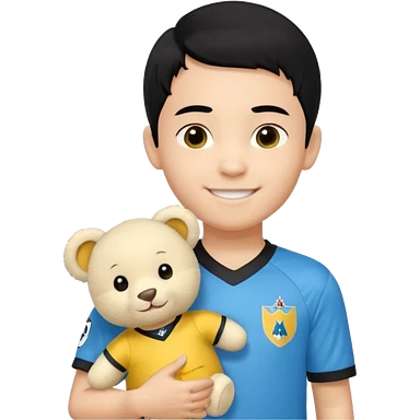 Un enfant qui a les cheveux noir sur le coter qui sourit il a un maillot de l’om et qui a un petit doudou jaune sur son epaule emoji