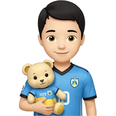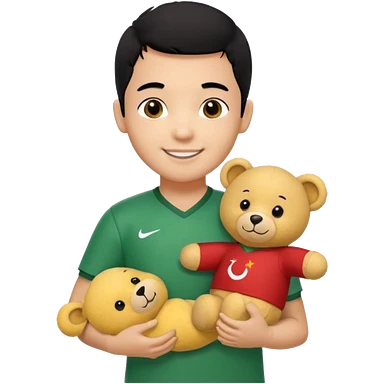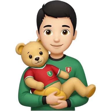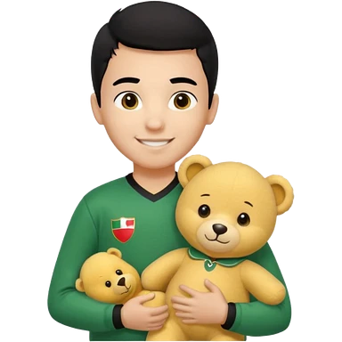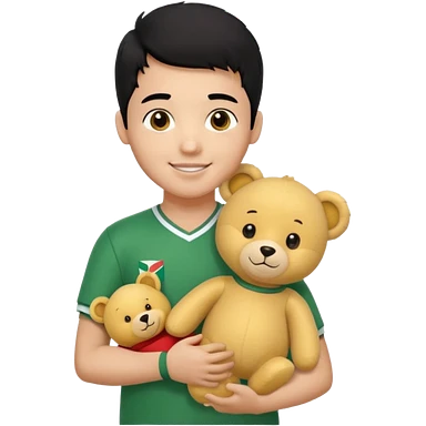 Une garçon qui a les cheveux noir qui sourit il a un maillot de l’algerie et qui a un doudou sur son epaule un ours jaune qui a des habille noir emoji