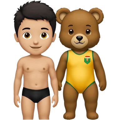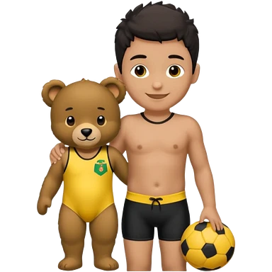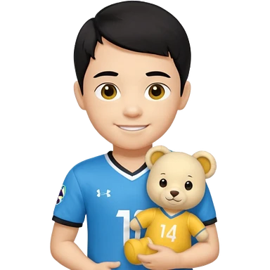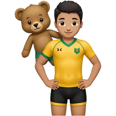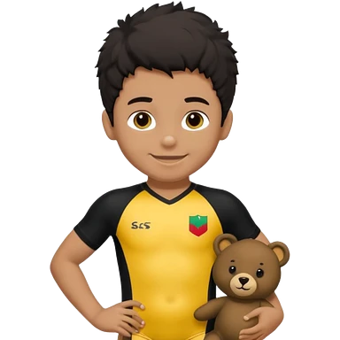Une garçon qui a les cheveux noir qui sourit il a un maillot de l’algerie et qui a un doudou jaune sur son epaule un ours jaune qui a des habille noir emoji