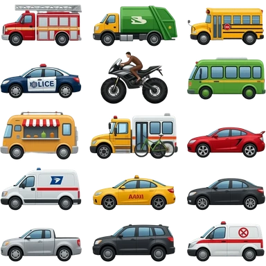 Car, fire truck, garbage truck, school bus, police car, motorcycle, monster truck, city bus, food truck, scooter, bicycle, tow truck, sport car, streetcar, jeep, taxi, limousine, mail truck, pickup truck, suv, minivan, van, and ambulance emoji