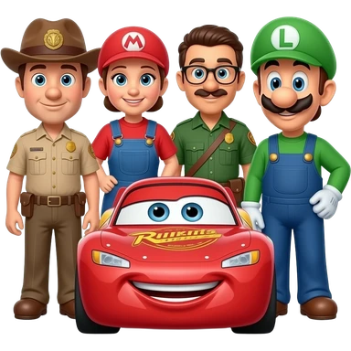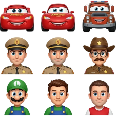 Lightning McQueen, tow mater, sally carrera, red, sheriff, sarge, Fillmore, Luigi, guido, and ramone emoji