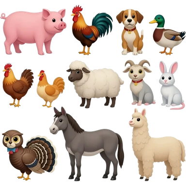 Cow, pig, rooster, dog, duck, cat, chicken, sheep, goat, mouse, rabbit, Turkey, owl, donkey, horse, and llama emoji