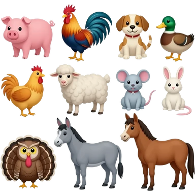 Farm animals: Cow, pig, rooster, dog, duck, cat, chicken, sheep, goat, mouse, rabbit, Turkey, owl, donkey, horse, and llama emoji