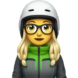 Green-eyed, fat female skier with long straight blonde hair, glasses, white helmet, grey snow jacket, long black pants, black only snow boots standing tall. emoji