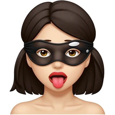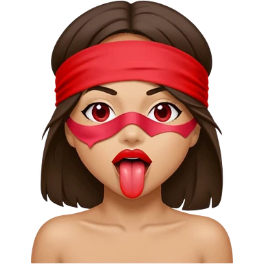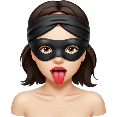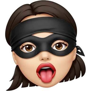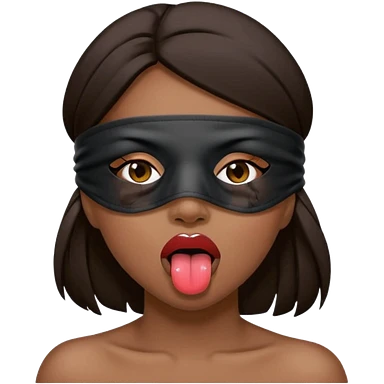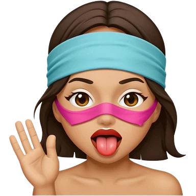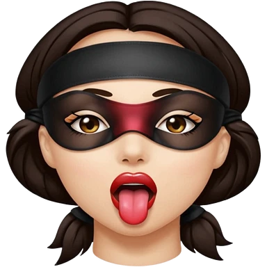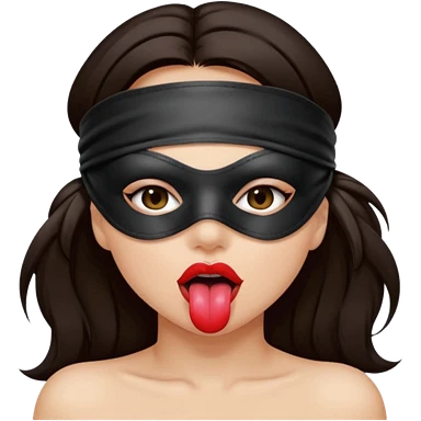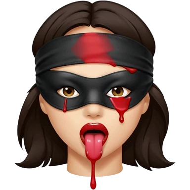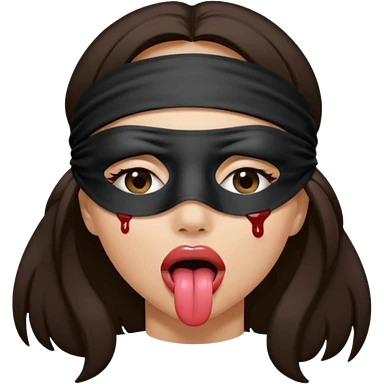 woman with dark brown hair wearing black blind fold completely covering her eyes. tongue out and saliva coming from mouth emoji
