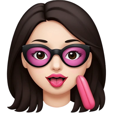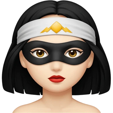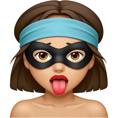 woman with dark brown hair wearing black band over eyes with tongue out emoji