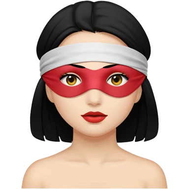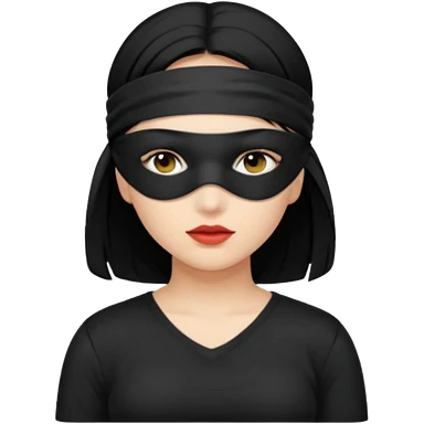 woman with dark brown hair wearing black blind fold completely covering her eyes. tongue out emoji