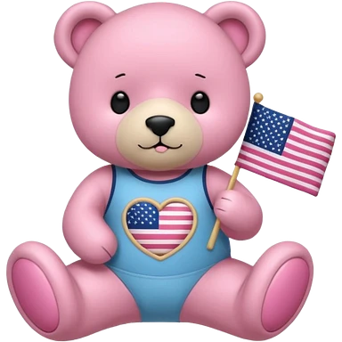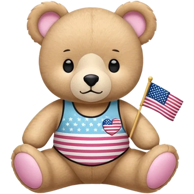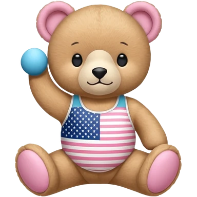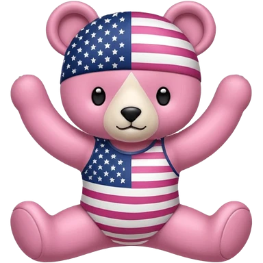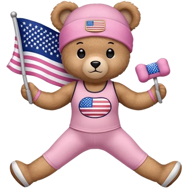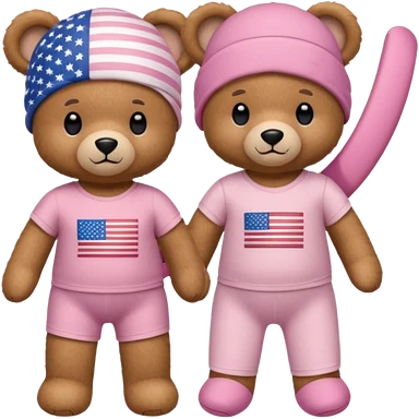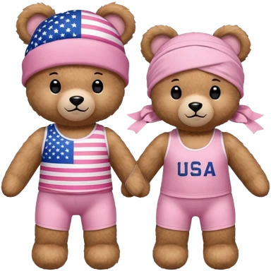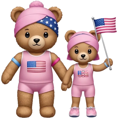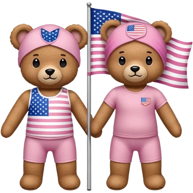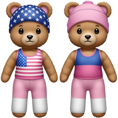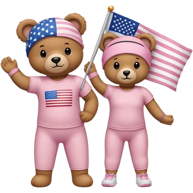 A light brown teddy bear wearing light pink clothes with a US flag print, and another with a Pilates band on its head and wearing sportswear. emoji