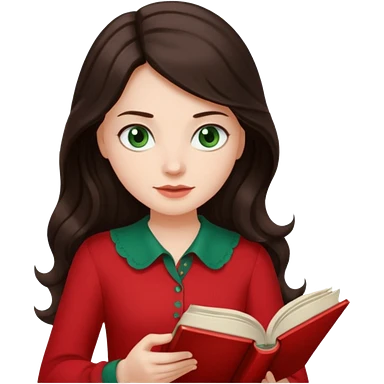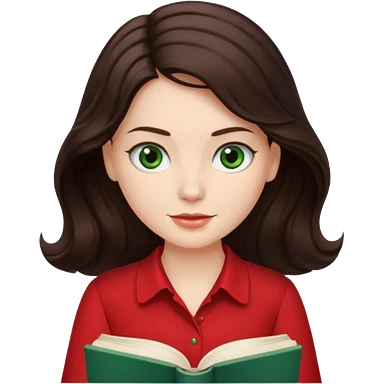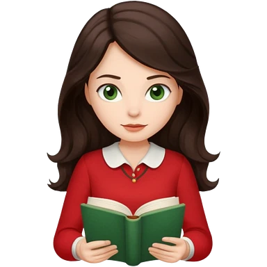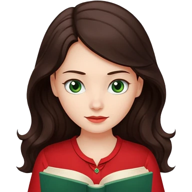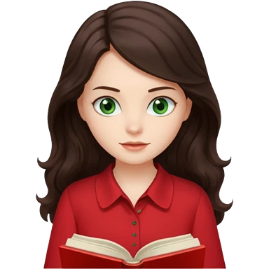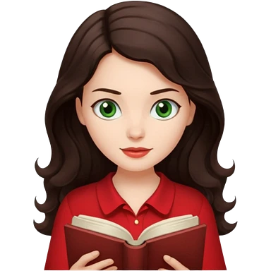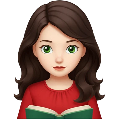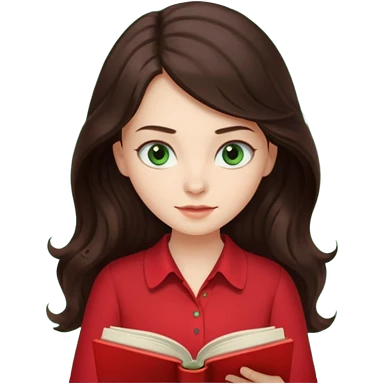 Long wavy dark brown haired, white skinned, dark green eyed girl in red blouse reading a book emoji