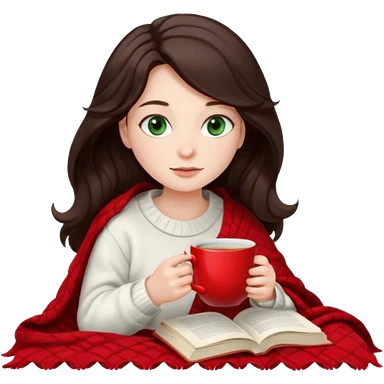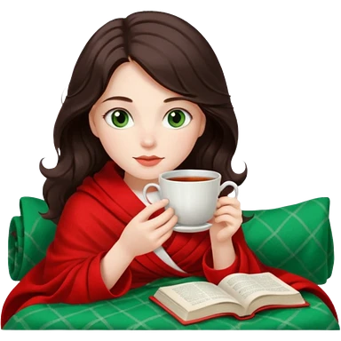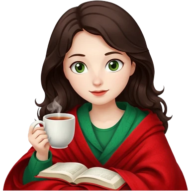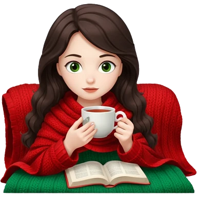 Long wavy dark brown haired, white skinned, dark green eyed girl wrapped in a red and white blanket, sipping tea and reading a book emoji