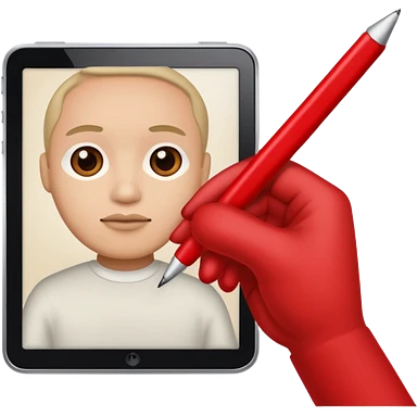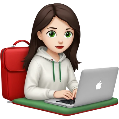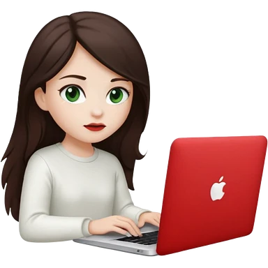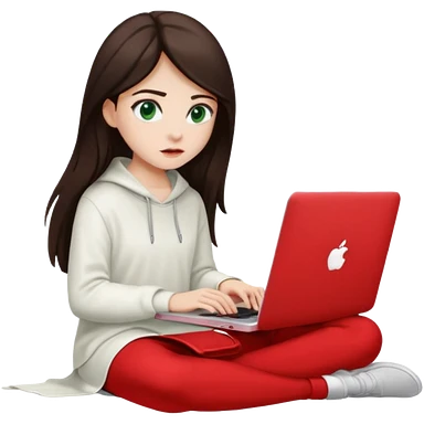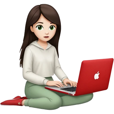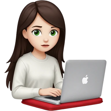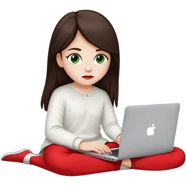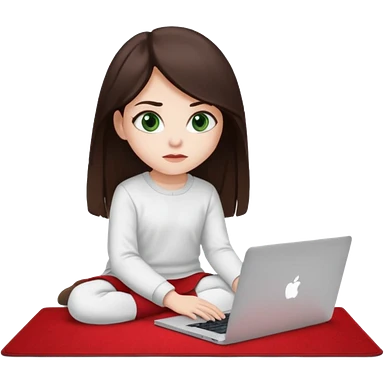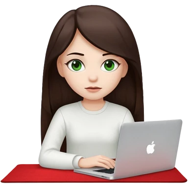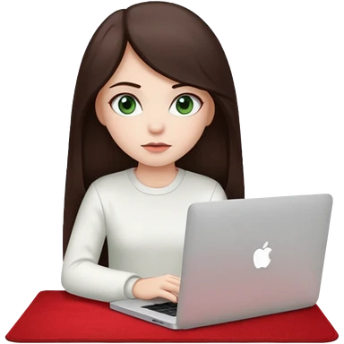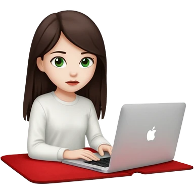 Long dark brown haired, white skinned, dark green eyed girl in white clothes girl sitting in macbook with a red carpet emoji