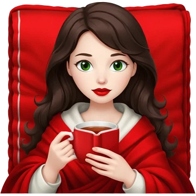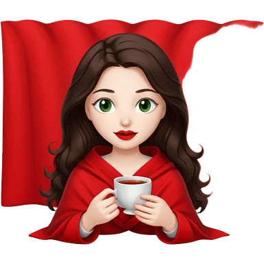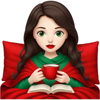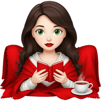 Long wavy dark brown haired, white skinned, dark green eyed girl with red lipstick wrapped in a red and white blanket, sipping tea and reading a book emoji