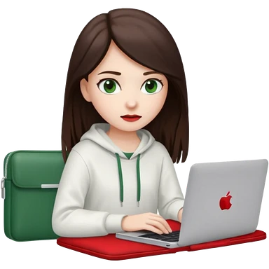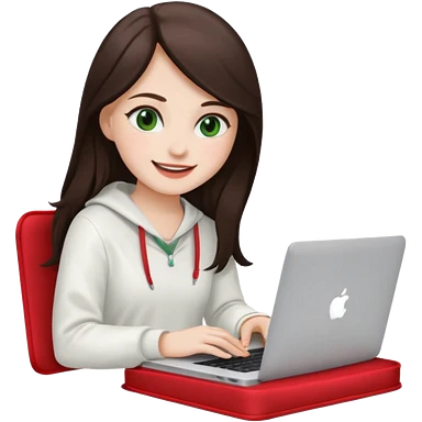 Long dark brown haired, white skinned, dark green eyed girl in white clothes girl sitting in macbook with a red case emoji