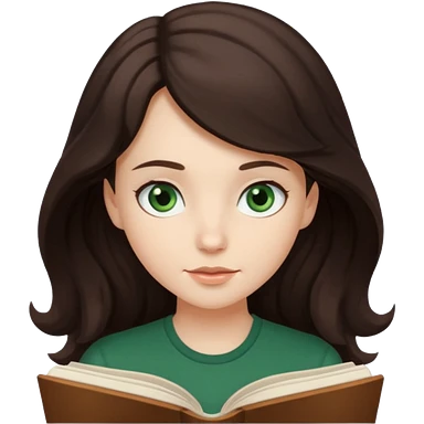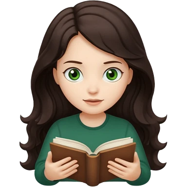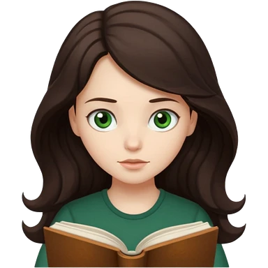 Long wavy dark brown haired, white skinned, dark green eyed girl reading a book emoji