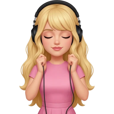 dior women with long blonde hair, pink dress wear a black headphones on head connect to pink iphone max pro and hold on headphones on head with hands on headphones with close eyes emoji