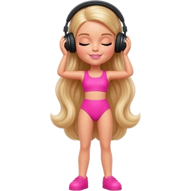 barbie in blonde hair and pink swimsuit and Pink shoes for women wear a black headphones on head connect to pink iphone max pro and hold on headphones on head with hands on headphones with close eyes emoji