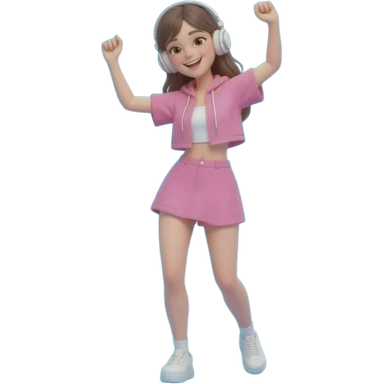 girl blonde long hair in pink dress listen to music rock and roll on black headphones on head connect to pink iphone max pro and hold on headphones on head with right hand emoji
