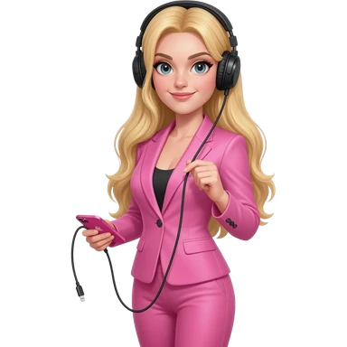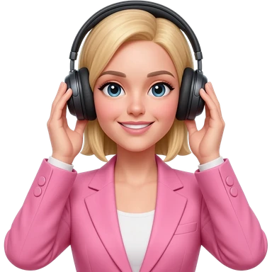 Woman in blonde hair and pink suit wear a black headphones on head connect to pink iphone max pro and hold on headphones on head with hands on headphones emoji