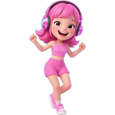 Pretty girl in pink hair and clothes and in super shiny pink headphones dances with pleasure in the midst of studio blue backdrop, copy space, high quality video emoji