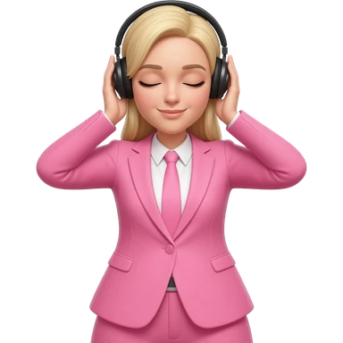 Woman in blonde hair and pink suit wear a black headphones on head connect to pink iphone max pro and hold on headphones on head with hands on headphones with close eyes emoji