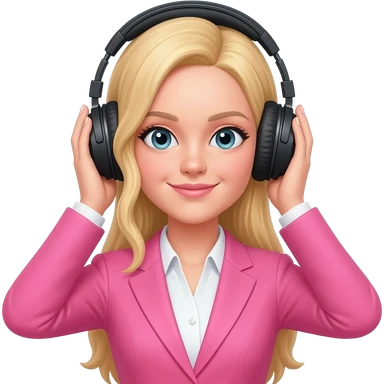 Woman in blonde hair and pink suit wear a black headphones on head connect to pink iphone max pro and hold on headphones on head with hands emoji