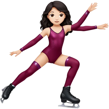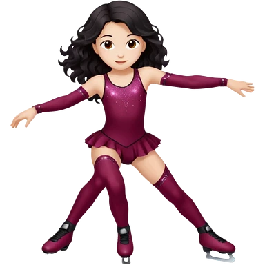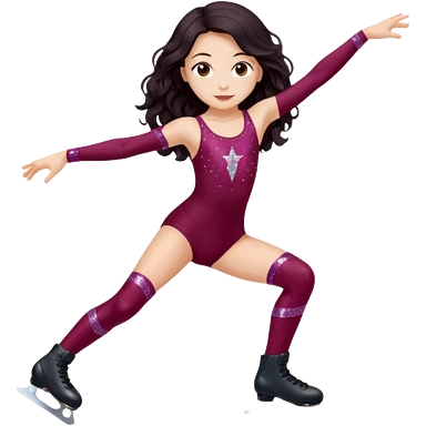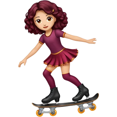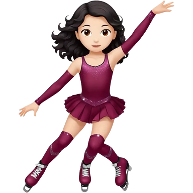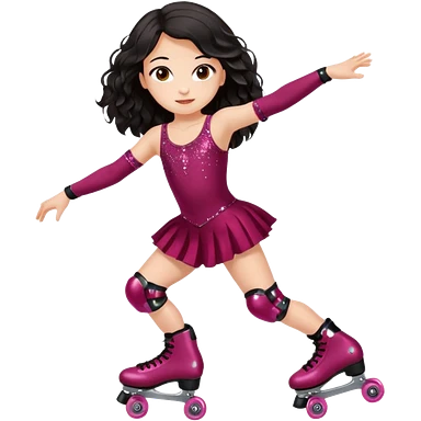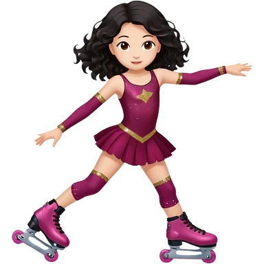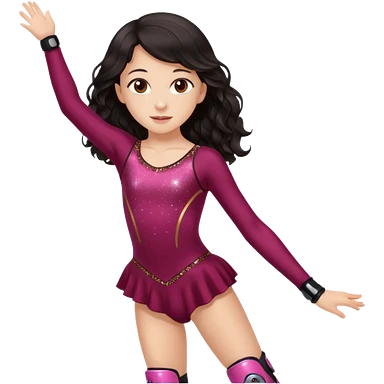 Una patinadora de 12 años y es morena de pelo y lleva un mallott granate con brillos y esta patinando con patines de ruedas en linea y su piel es clara y el pelo es largo negro ondulado emoji