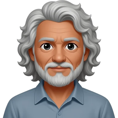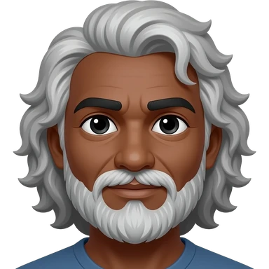 رمادي بشره قمحيّة اللون وعمرة ستون عاما رجل شعره كيرلي رمادي طويل عيناه اسود له لحية emoji