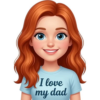 a 13 year old girl with long red hair smirking with a shirt that says I love my dad emoji