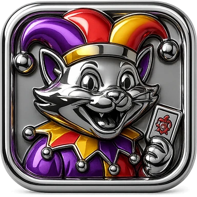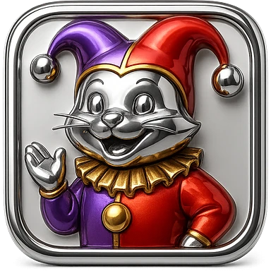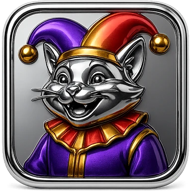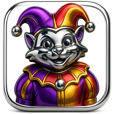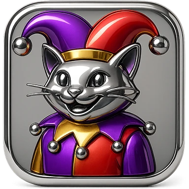 crazy colorful cute little cat jolly joker from poker, medieval, vintage, court jester, mac os icon, purple, gold and red color, half body. Squared shape as 3D mac os icon, symmetrical emoji