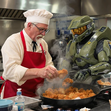 kentucky fried covenant from Halo:CE being cooked and taste tested by Colonel Sanders [aka the KFC man] and JOHN-117 MASTER CHIEF emoji