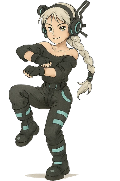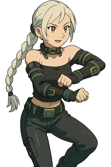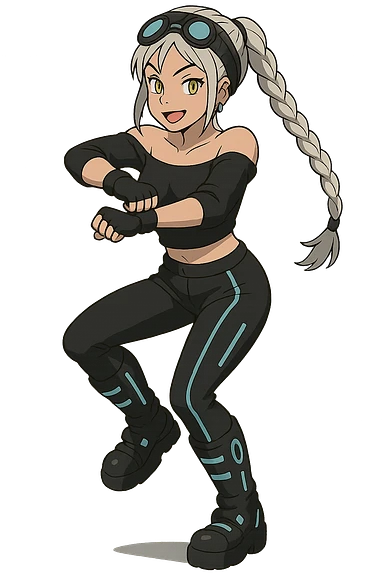 1 female, gold yellow eyes, long white braid, black off shoulder top, futurepunk cybergoth doing “oppa gangnam style” dance emoji