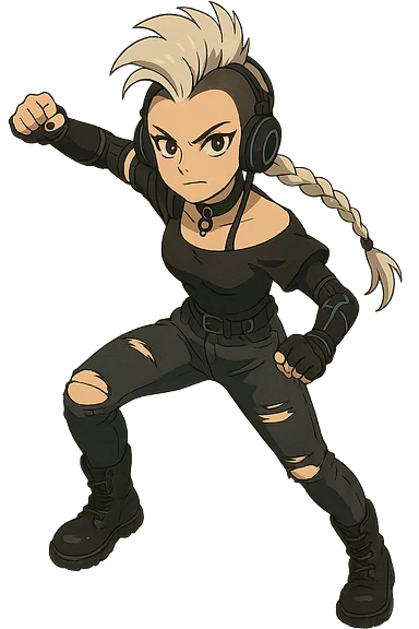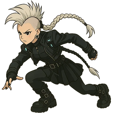 1 female, cyberpunk, mohawk white hair, 1 long braid, cybergoth, gothic style, action pose, style of anime emoji